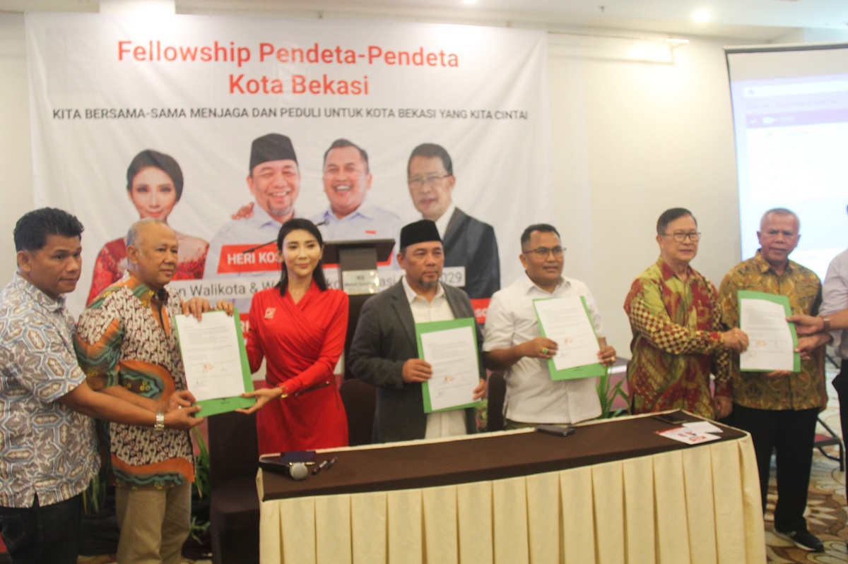 DPDPKSKOTABEKASI- Calon Wali Kota Bekasi nomor urut 01, Heri Koswara, menyatakan komitmennya dalam menjaga toleransi beragama setelah menandatangani nota kesepahaman dengan ratusan pendeta di Kota Bekasi. “Selama 20 tahun berkarir di politik, baru kali ini saya mendapatkan dukungan besar dari saudara-saudara non-Muslim, terutama para pendeta,” ujar Heri usai acara penandatanganan di Hotel Santika Megacity, Bekasi, pada Kamis, 26 September 2024.