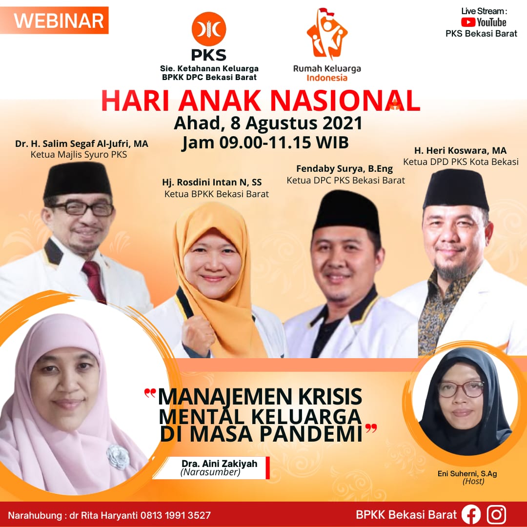 DPDPKSKOTABEKASI – BPKK DPC PKS Bekasi Barat dalam rangka hari anak nasional menyelenggarakan agenda webinar “Manajemen Krisis Mental Keluarga di Masa Pandemi”.