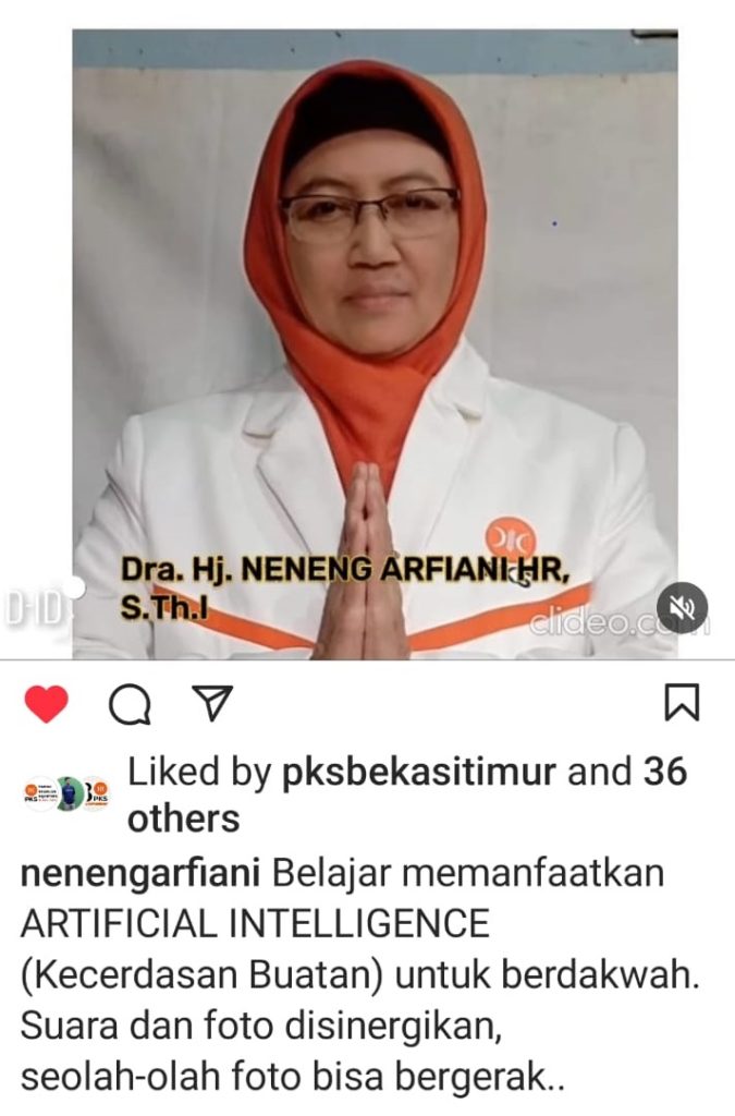Aku merasa senang sekali. Nampaknya tugasku ini bisa selesai lebih cepat. Saking senangnya, aku upload video itu di IG ku, @nenengarfiani dengan caption “Belajar memanfaatkan ARTIFICIAL INTELLIGENCE (Kecerdasan Buatan) untuk berdakwah. Suara dan foto disinergikan, seolah-olah foto bisa bergerak.”.
